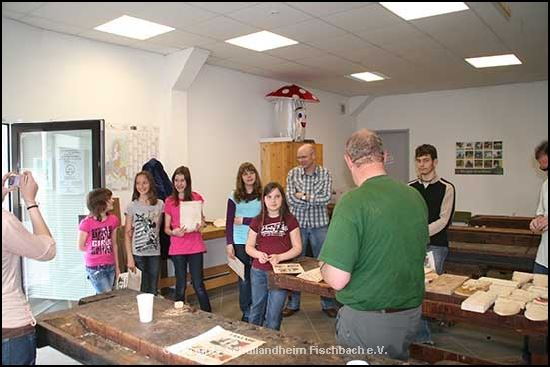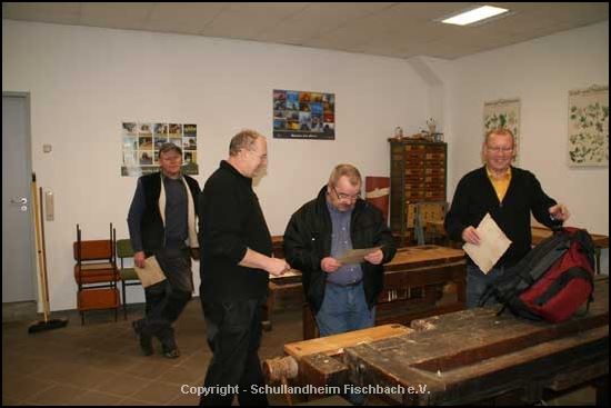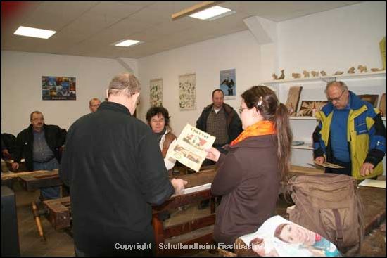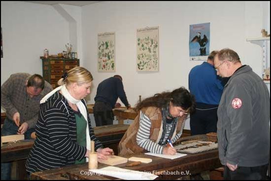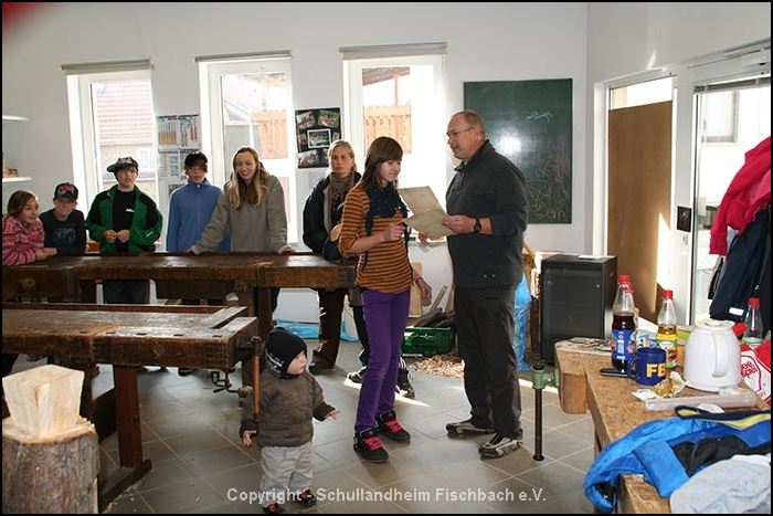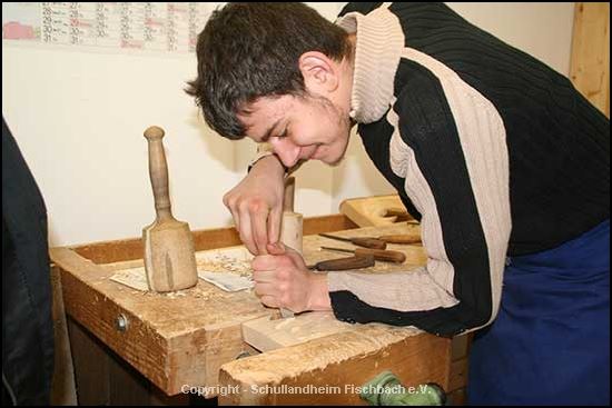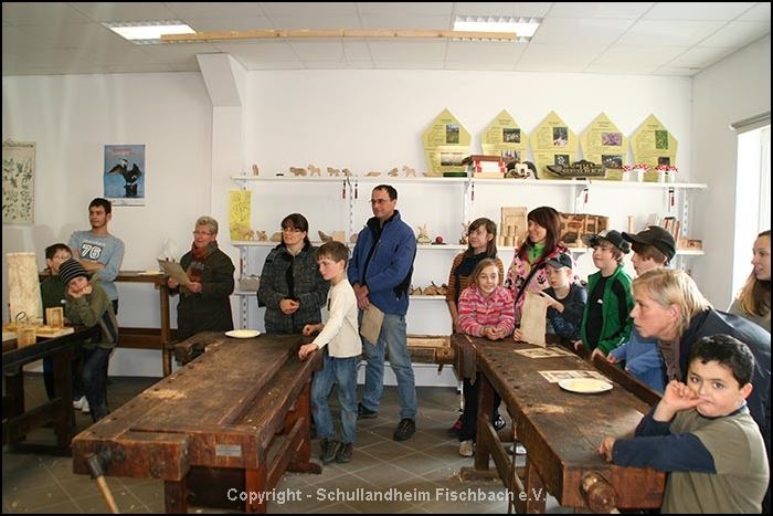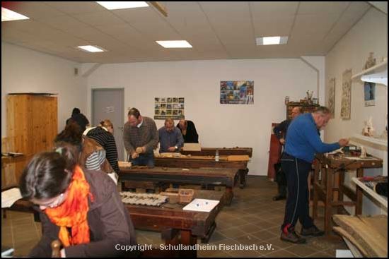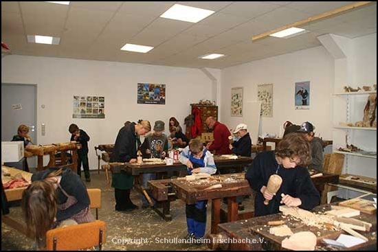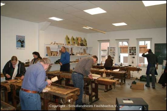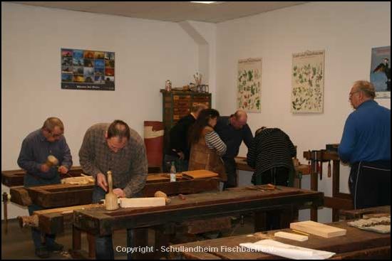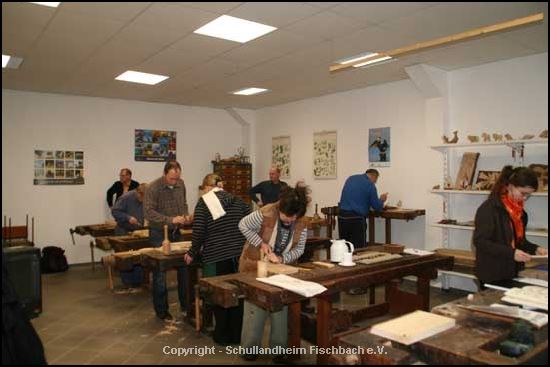 Es wurde lange Zeit darüber beraten, wie, wo, wann und ob überhaupt das Schullandheim Fischbach zu seinen Kinderschnitzkursen auch Kurse für Erwachsene anbieten sollte. Nachdem aber nun im vergangenen Jahr der Kreativraum eingerichtet war und damit optimale Bedingungen für die Durchführung von Kursen geschaffen wurden, sollte nun am 19.02.2011 der Probelauf im Erwachsenenbereich starten. Unter der bewährten Leitung der aus Klings stammenden Holzbildhauermeisterin Kerstin Genschow trafen sich 6 Männer und 2 Frauen, um sich am trationelle Handwerk der Rhön auszuprobieren oder vorhandene Kenntnisse zu vertiefen. So wurde der Kurs auch unter kein bestimmtes Thema gestellt. Während die Einen Kerb- und Hohlschnitt übten, versuchten sich die Anderen an dem Gestalten von Obstschalen oder arbeiteten an mitgebrachten Tierfiguren.