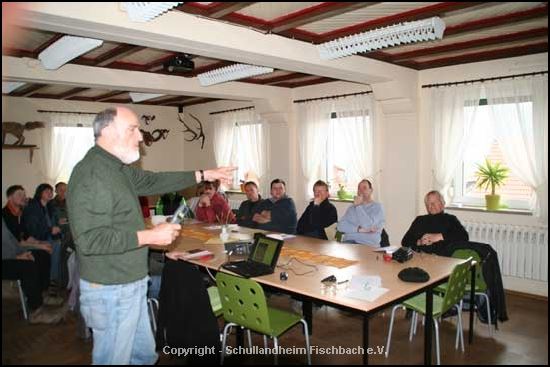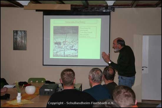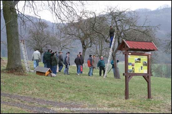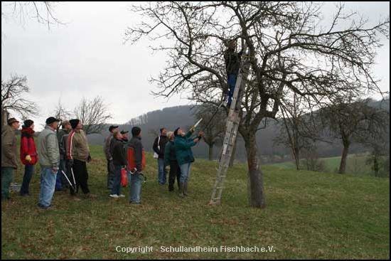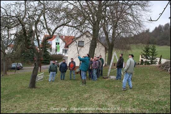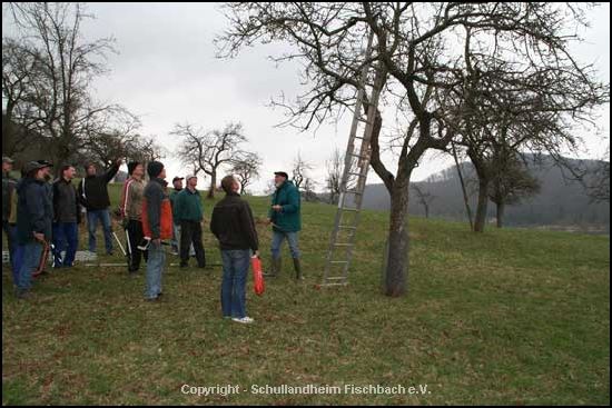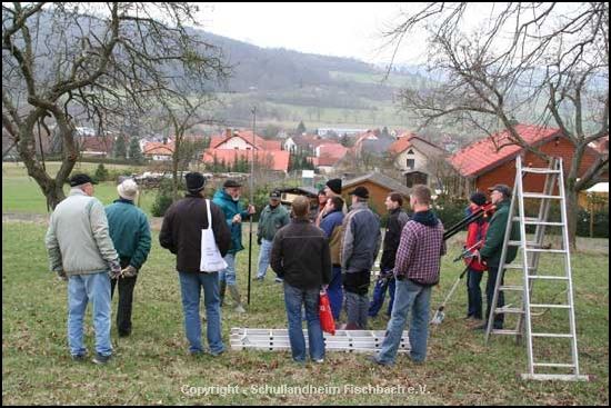 Der Baumberater Gerhard Schmidt aus Fischbach hatte zu einem Baumschnittkurs ohne Hokus - Pokus nach den natürlichen Wuchsgesetzen eingeladen. Da viele Teilnehmer schon am Kurs Veredlung teilgenommen hatten, konnte Herr Schmidt in seinen theoretischen Teil hier lückenlos anknüpfen. Das im theoretischen Teil Erlernt,e wurde dann an den uralten Bäumen der Streuobstwiese neben dem Schullandheim praktisch ausprobiert.